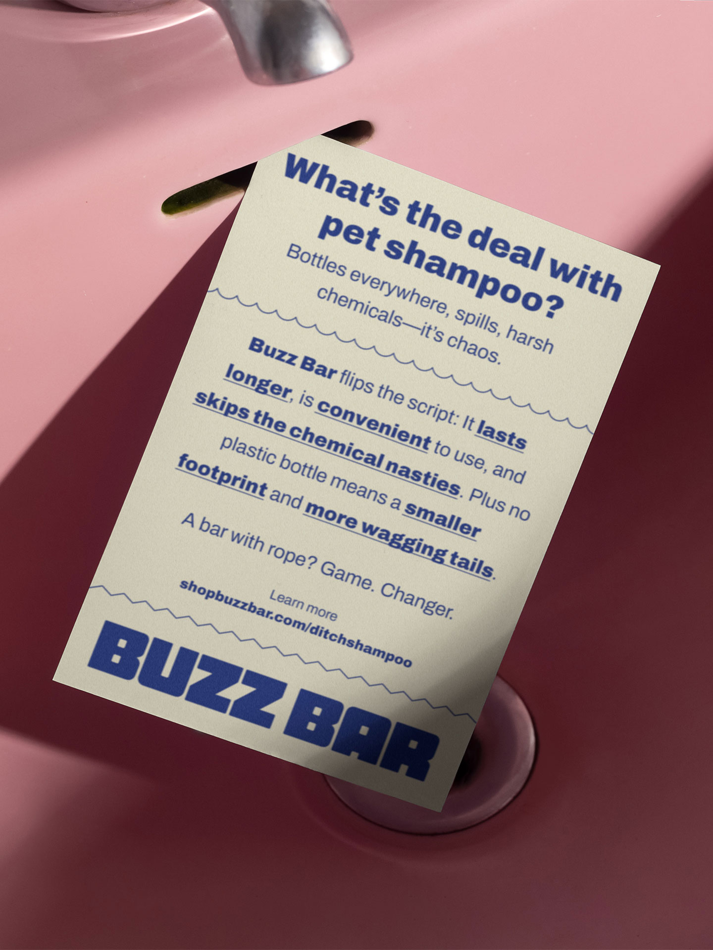BRIER partnered with Buzz Bar to provide brand strategy and identity design support for its new venture in the pet care space. The concept involved a soap-on-a-rope, offering a simple solution for bath time. Dog shampoo is fine, but having to constantly pause to reach for the shampoo bottle during bath time can be a pain.